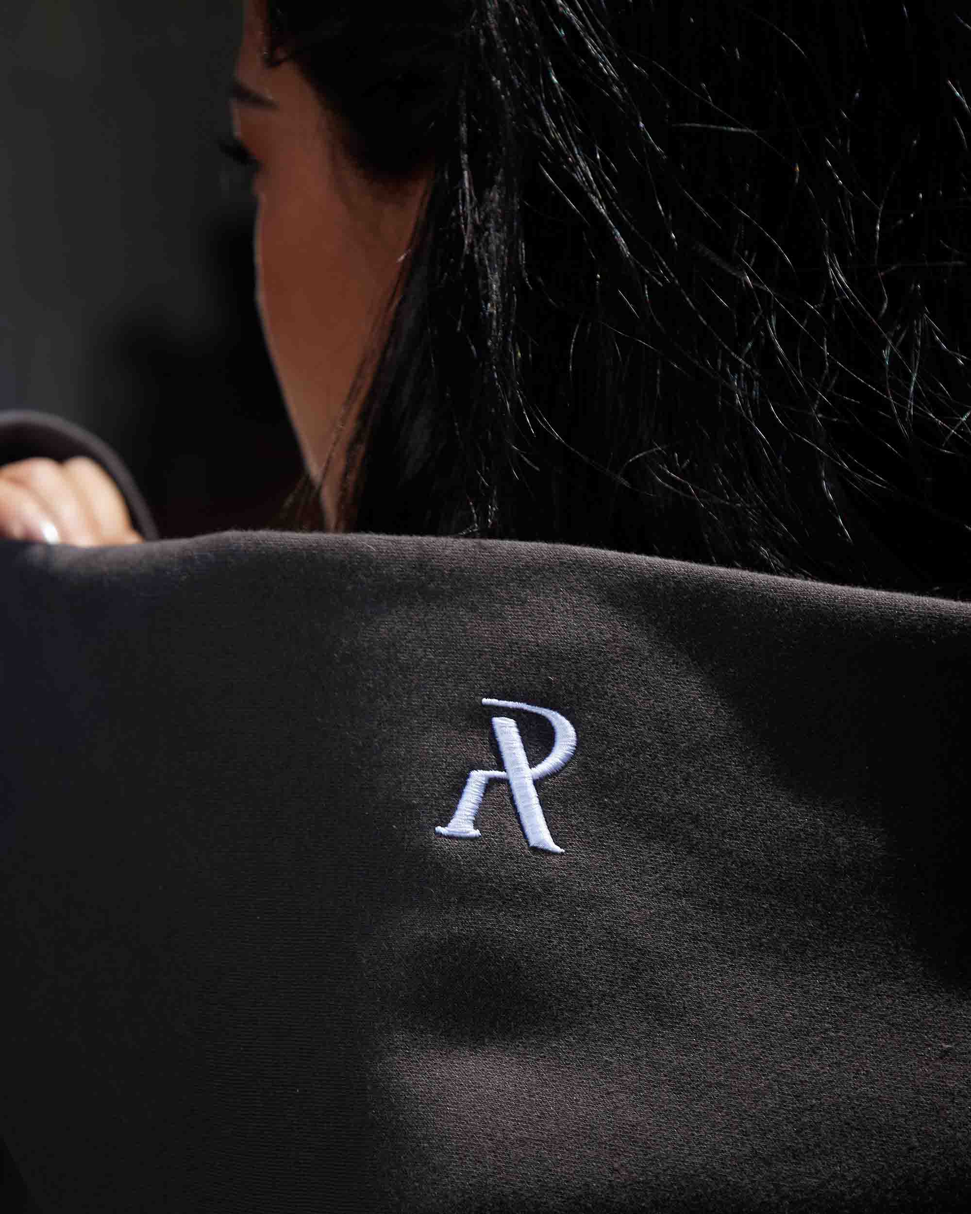 This core classic zip hoodie has been reimagined with an angelic twist. Made with Realism's signature comfy fleece in an oversized black guise, this zip hoodie features metal accents including custom "R" branded zip, chest emblem and pocket tag. An embroidered "R" on the hood, sleeve cuff embroidery and the exclusive screen printed cherub on the back makes this piece a dream.