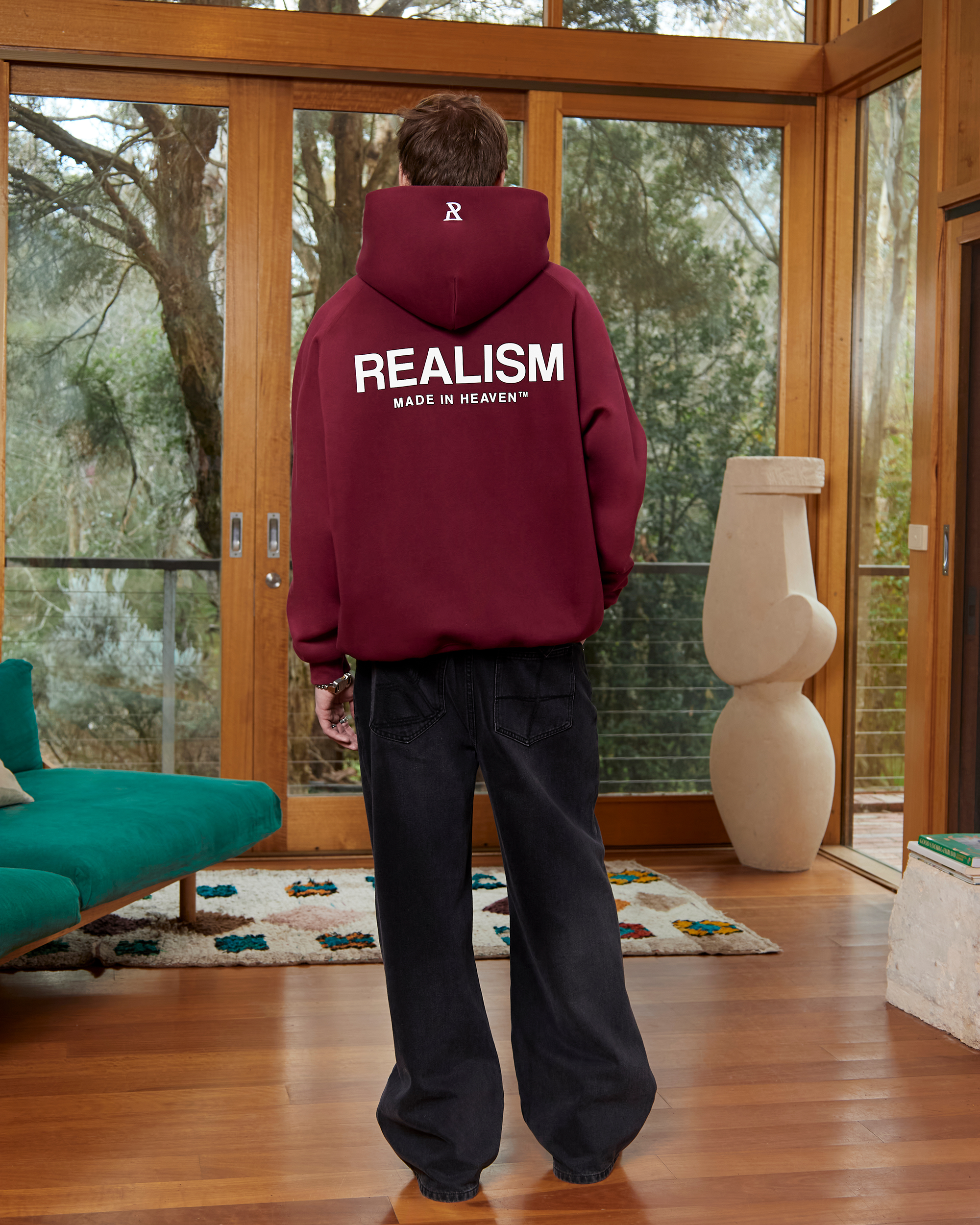 The ultimate hoodie. Premium, comfortable, and designed with purpose. Featuring Realism's signature 350 GSM fleece crafted into a raglan, oversized silhouette, this hoodie is accentuated with 3-dimensional silicone applique logos on the front and back. An embroidered "R" logo on the hood and a "Made in Heaven" motif on the right sleeve complete this iconic design.