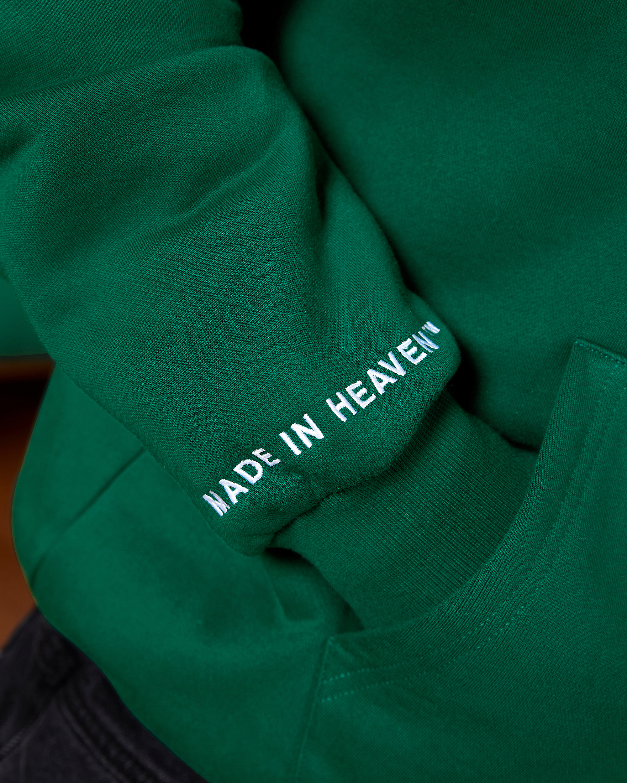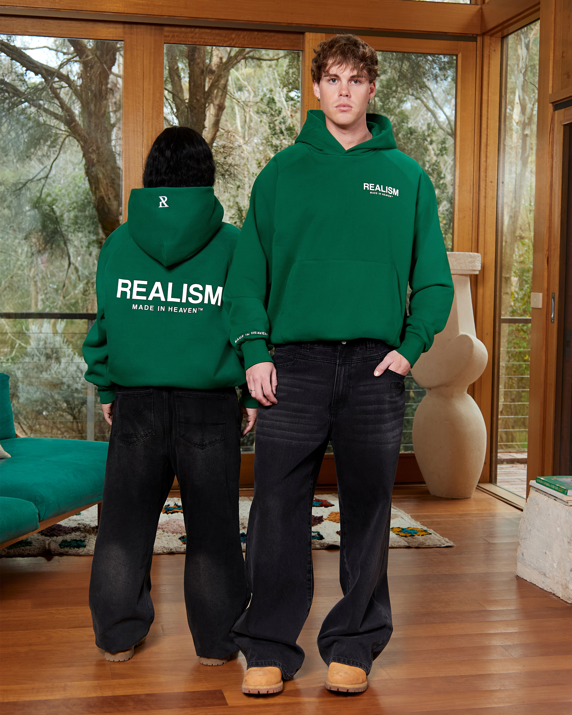 The ultimate hoodie. Premium, comfortable, and designed with purpose. Featuring Realism's signature 350 gsm fleece crafted into a raglan, oversized silhouette, this hoodie is accentuated with 3-dimensional silicone applique logos on the front and back. An embroidered "R" logo on the hood and a "Made in Heaven" motif on the right sleeve complete this iconic design.