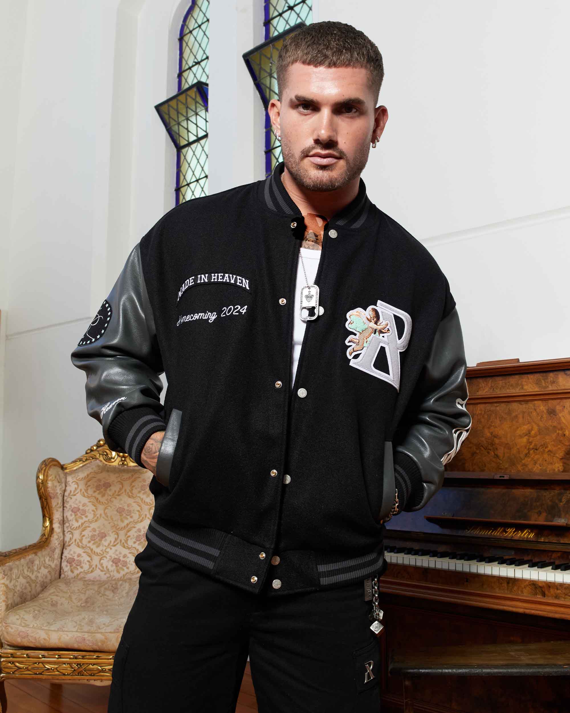 The centrepiece of the Homecoming Collection. Featuring embroidered and chenille appliqués, felt patch work and wool-look fabrication. Constructed in luscious pebbled leather and a wool-like cotton blend, this is an instant classic to amp up any fit.