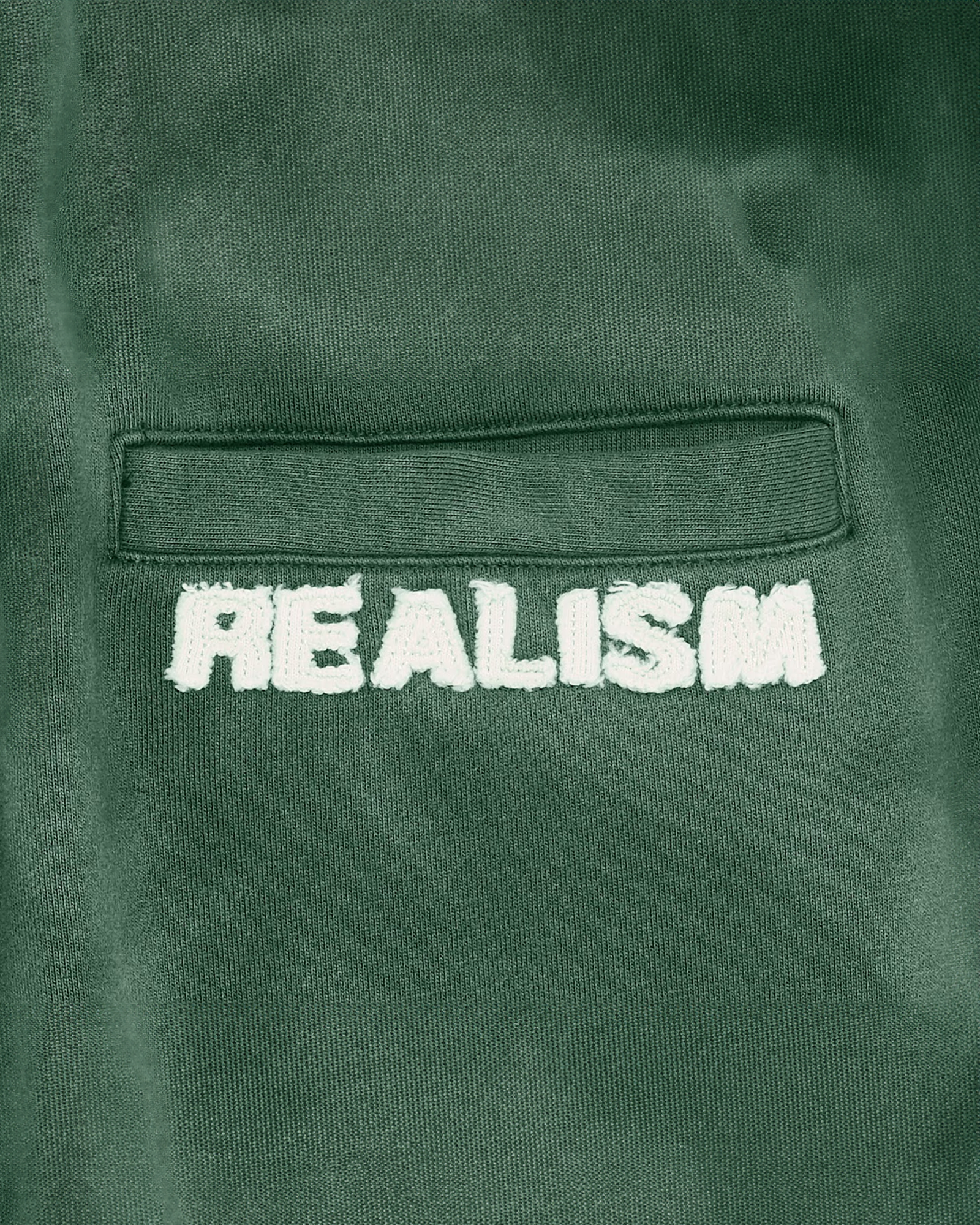 The Legacy Sweatpant in Washed Moss represents the next evolution of Realism's design identity. Made with an acid washed French Terry in a green guise. These sweatpants feature a distressed patchwork “R” on the upper thigh and “REALISM” on the back pocket. Custom metal accents and embroidered “MADE IN HEAVEN” on the hem help bring together the design.