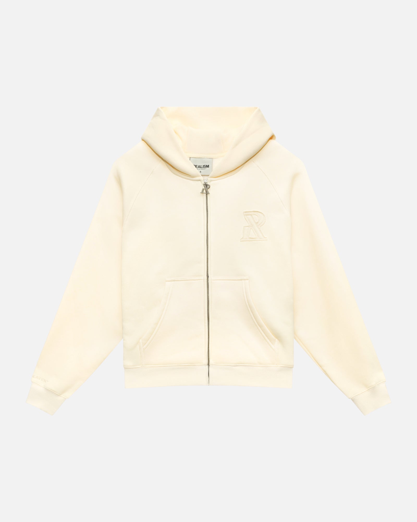 The Legacy Series represents the next evolution of Realism's design identity. Made with Realism's signature comfy fleece in a Cloud guise. This zip hoodie features distressed patch work including the “R” on chest and “REALISM” on back. Custom metal accents and silicon applique logo on the hood help bring together the design.