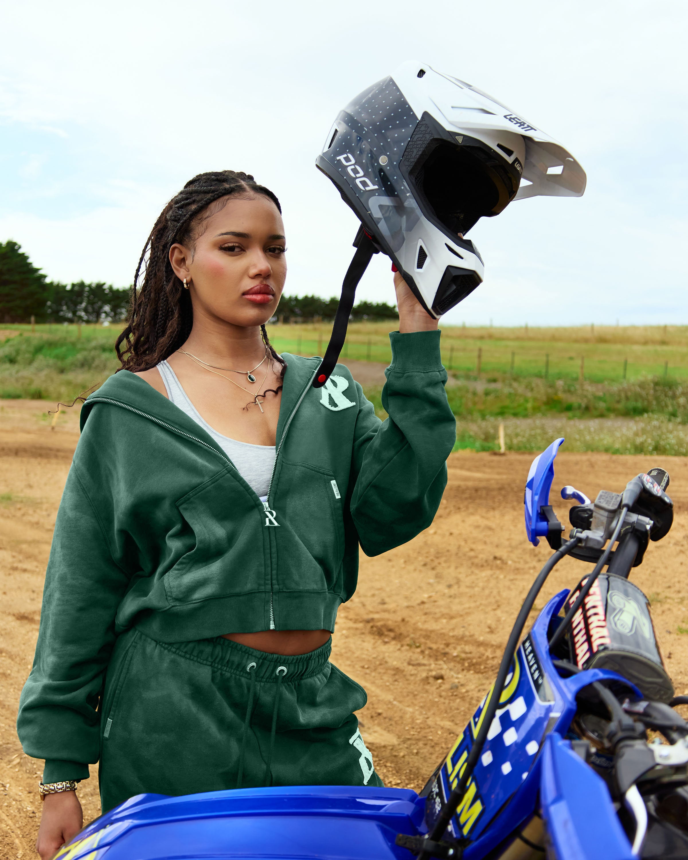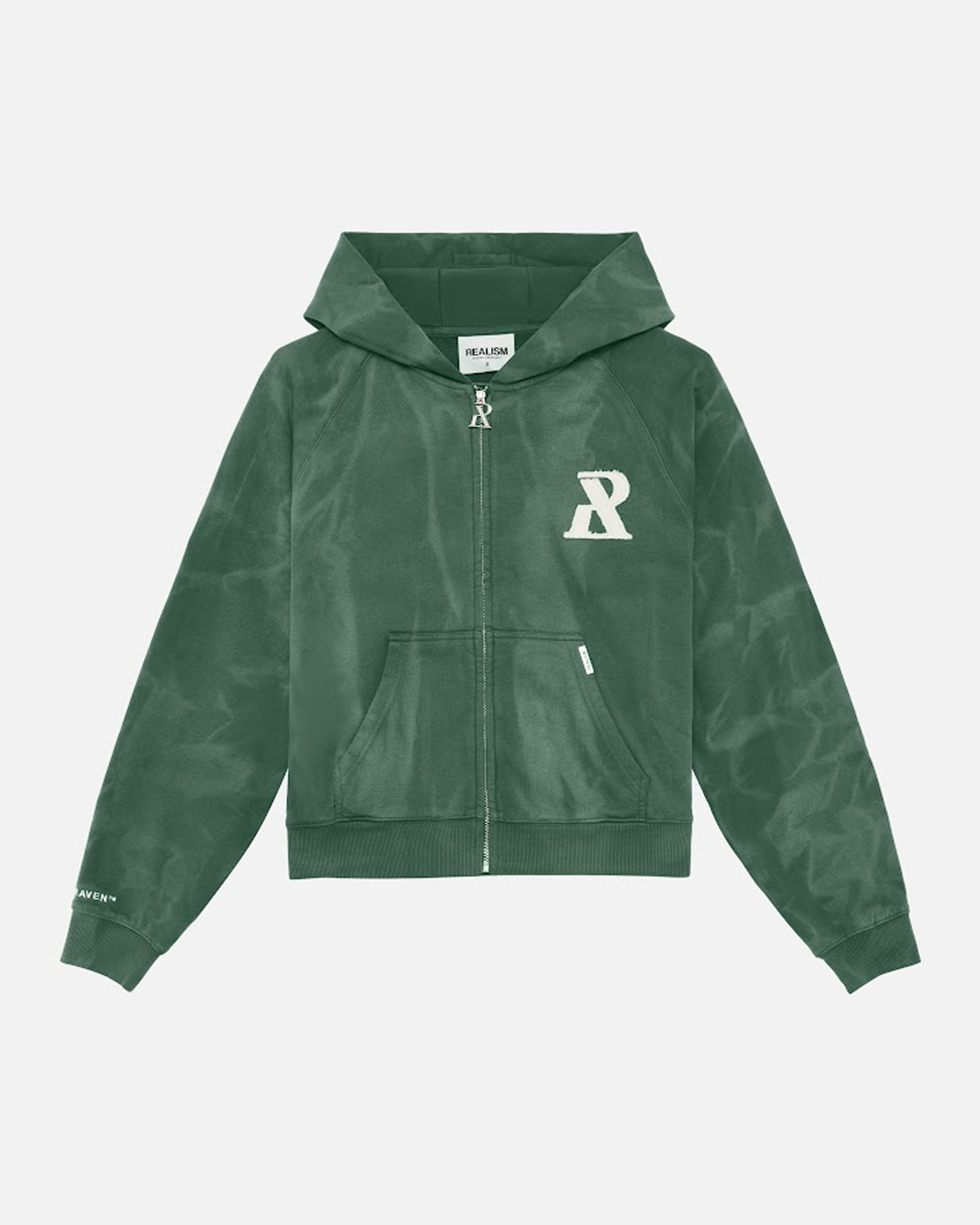 The Legacy Series represents the next evolution of Realism's design identity. Made with an acid washed French Terry in a Washed Moss guise. This zip hoodie features distressed patch work including the “R” on chest and “REALISM” on back. Custom metal accents and a silicon applique logo on the hood help bring together the design.
