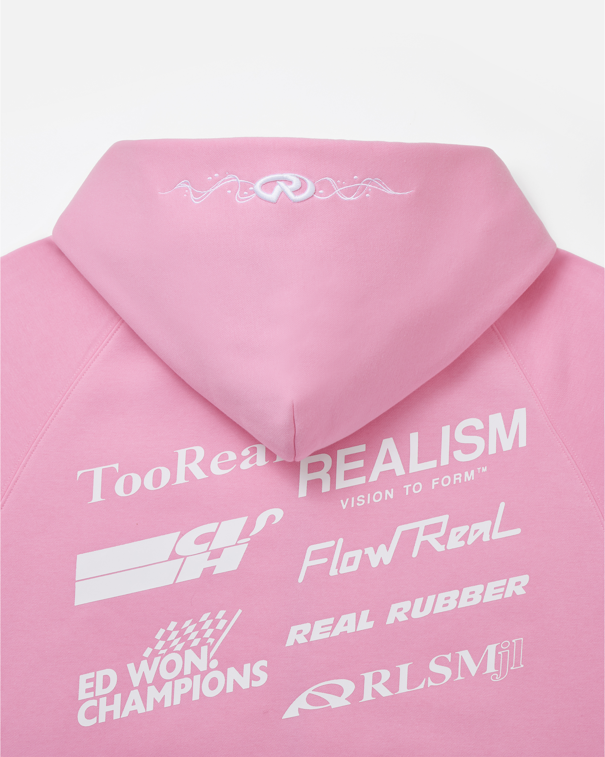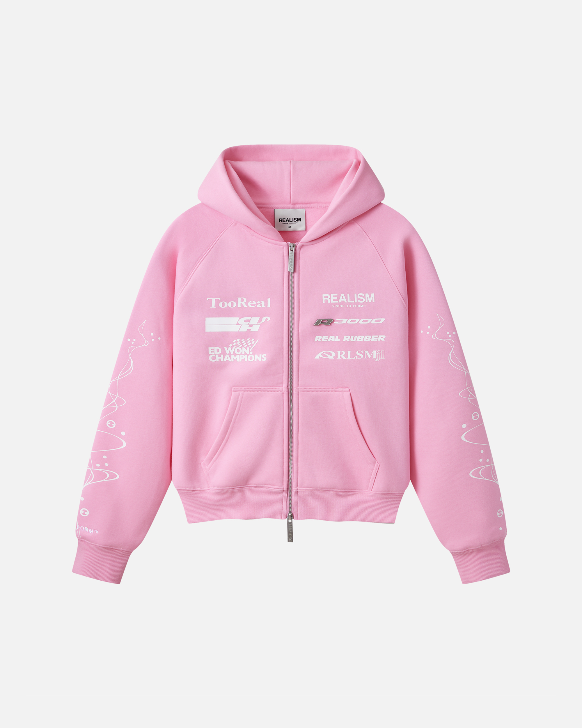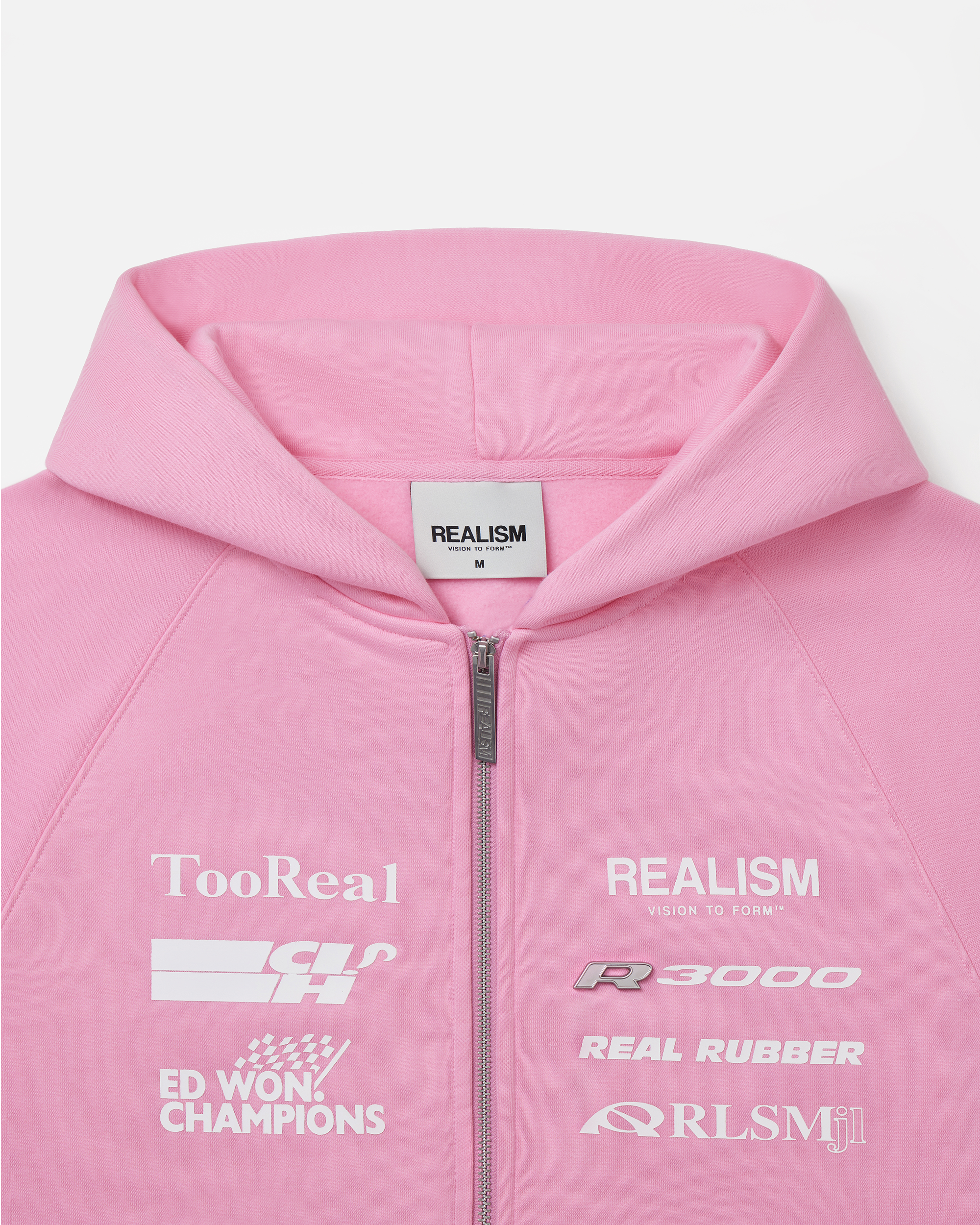 Inspired by motorsport graphics and speed-driven design, the The R3000 Zip Hoodie in Candy Pink is part of our Racer Collection. Featuring bold front, back and sleeve placements, this piece takes cues from racing decals with layered text elements. Finished with custom REALISM metal zip hardware and signature detailing throughout.