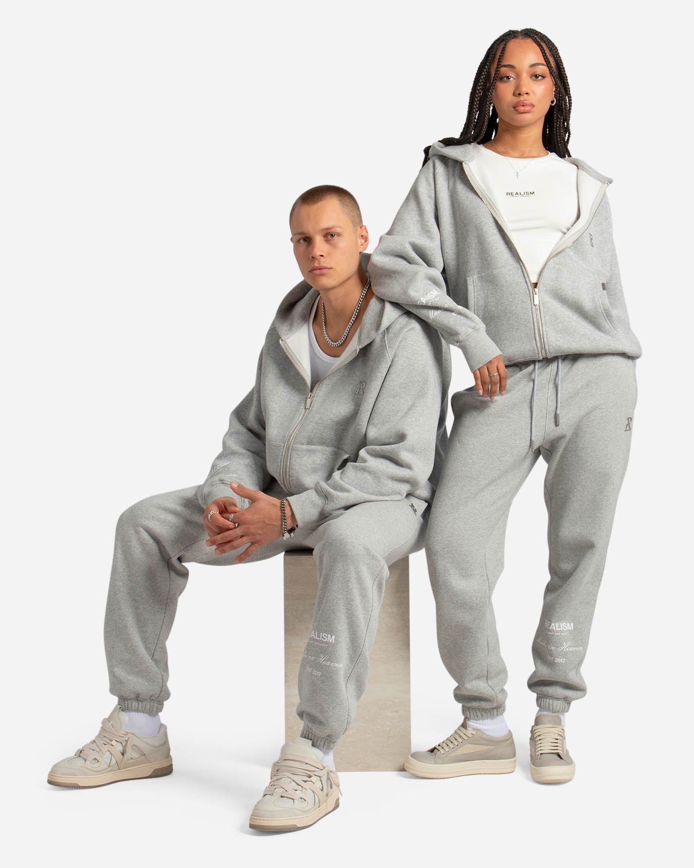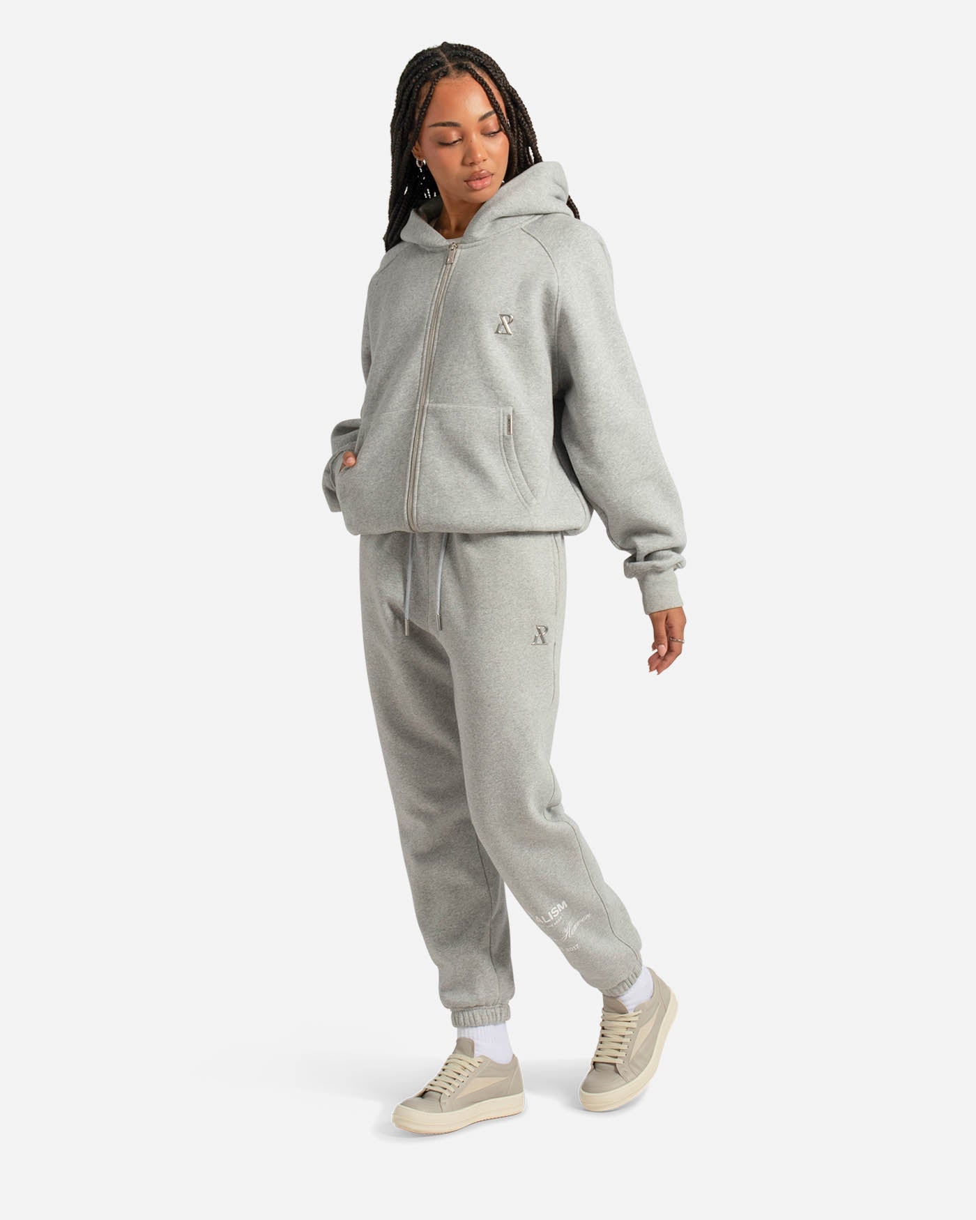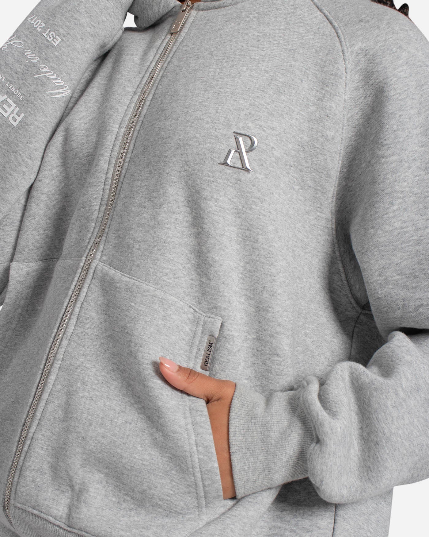 This staple zip hoodie is refreshed with a deluxe signature from the Realism Radiant collection. Made with Realism's signature comfy fleece in a oversized Grey Marle guise, this zip hoodie features metal accents including custom "R" branded zips, chest emblem and tag. An embroidered "R" on the hood, silicon applique logo on the back and sleeve print ties together a design that captures the essence of premium loungewear.