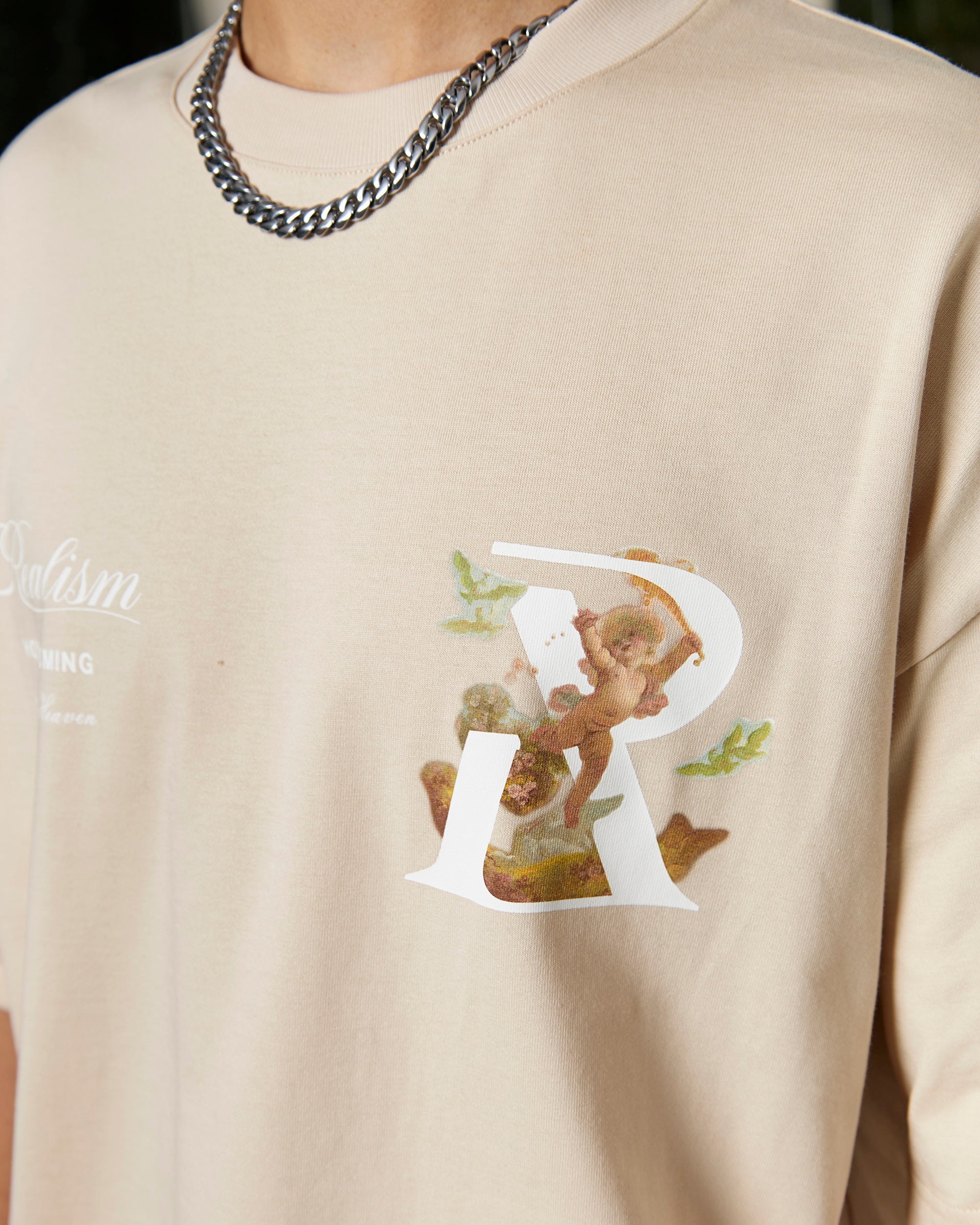 The Realm of Angels Tee from the Homecoming Collection features bold chest prints along with an embroidery motif on the nape, top off with a perfect oversize fit to match any cargos or jeans and sneakers.