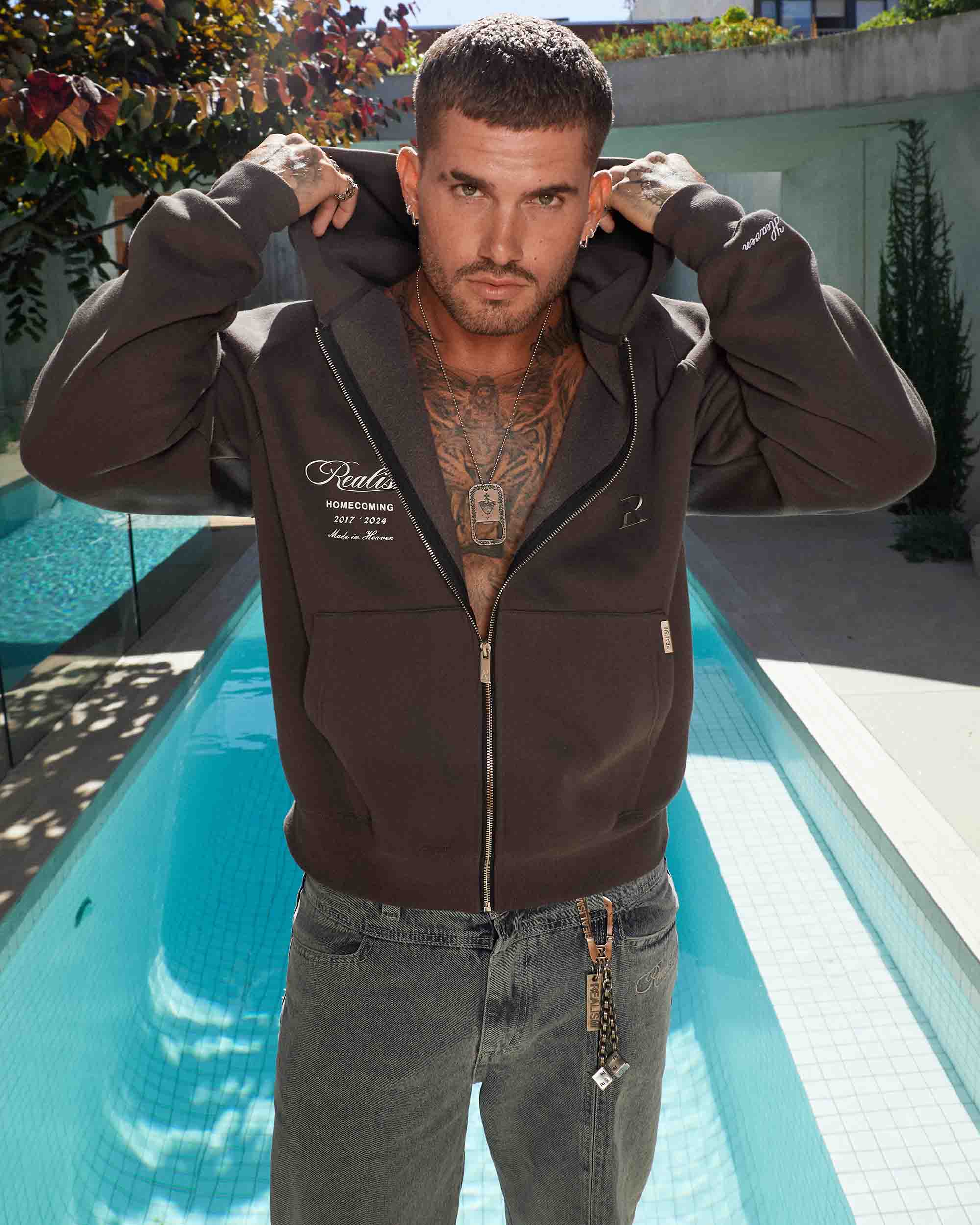 This core classic zip hoodie has been reimagined with an angelic twist. Made with Realism's signature comfy fleece in an oversized silhouette, this zip hoodie features metal accents including custom "R" branded zip, chest emblem and pocket tag. An embroidered "R" on the hood, sleeve cuff embroidery and the exclusive screen printed cherub on the back makes this piece a dream.