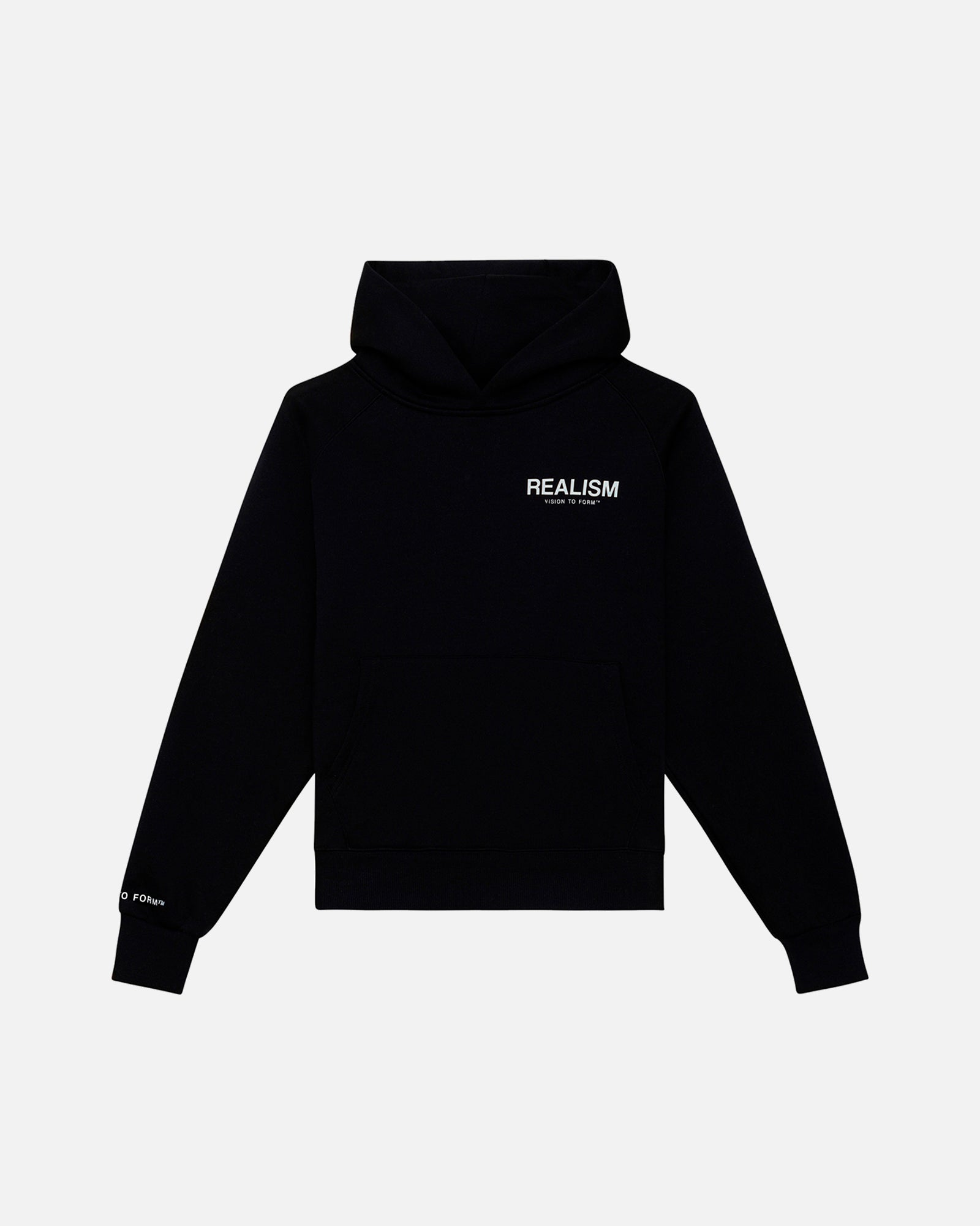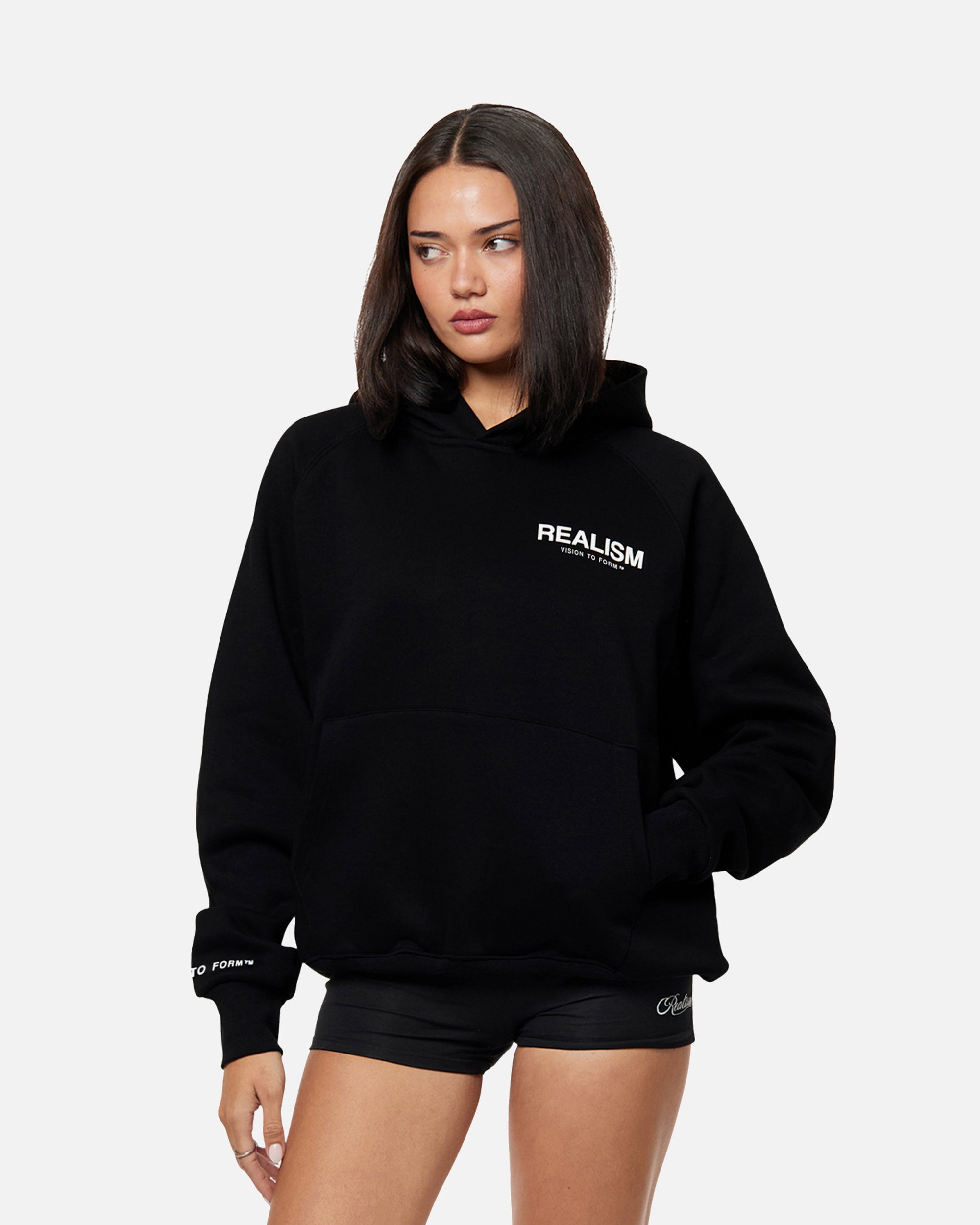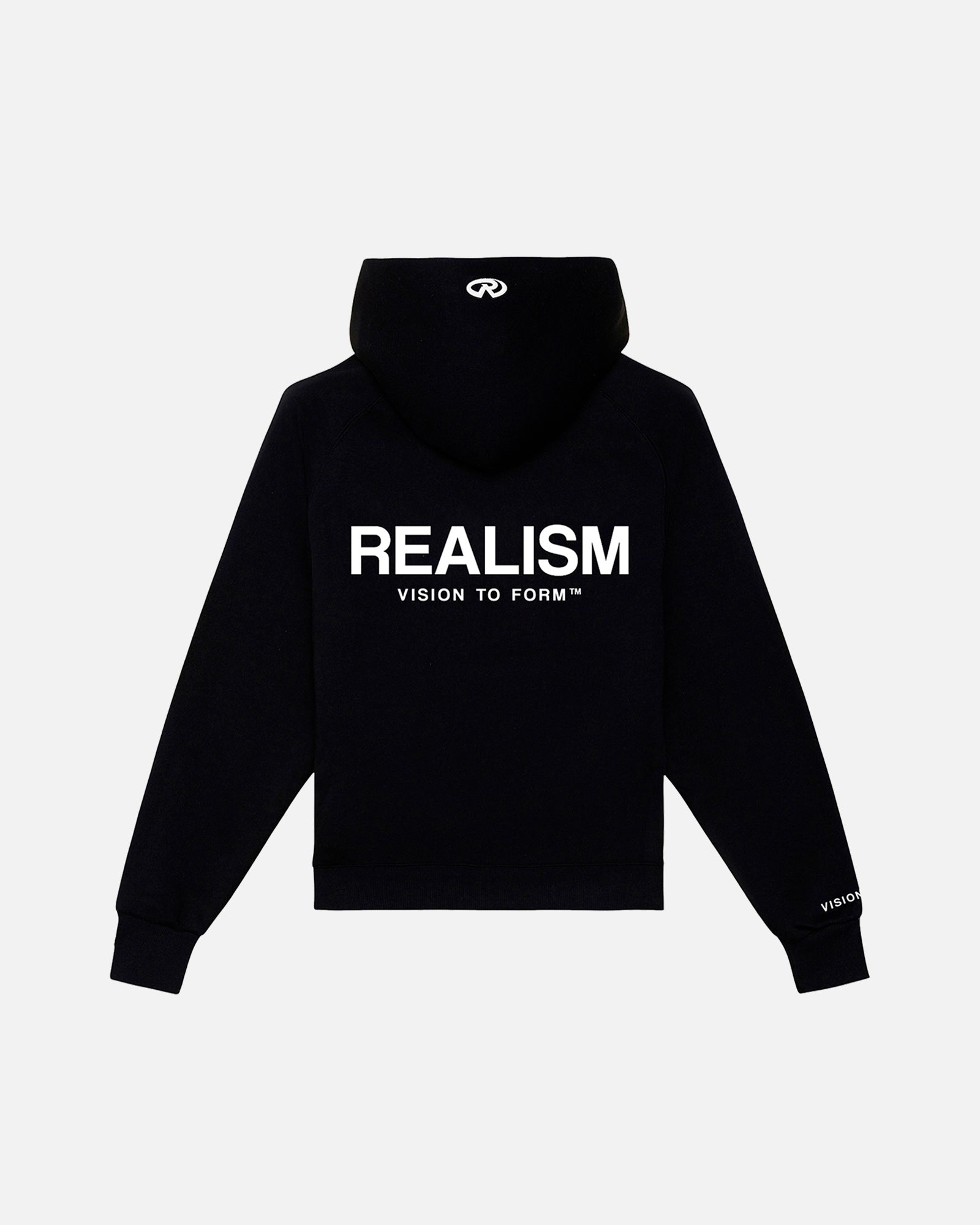 The ultimate hoodie. Premium, comfortable, and designed with purpose. Featuring Realism's signature 350 GSM fleece crafted into a raglan, oversized silhouette, this hoodie is accentuated with flock applique logos on the front and back. An embroidered "R" logo on the hood and a "Vision To Form" motif on the right sleeve complete this iconic design.