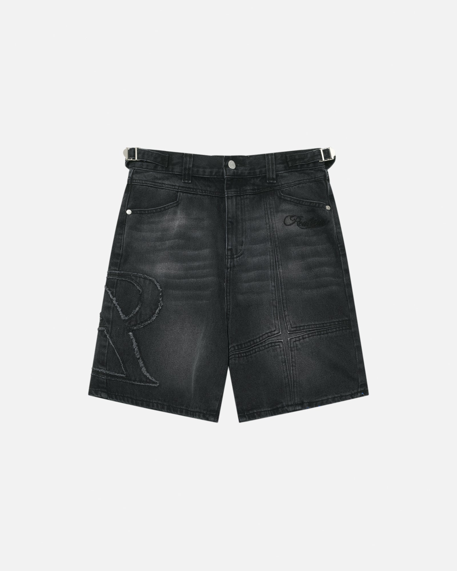 - Double needle stitched denim patchwork details