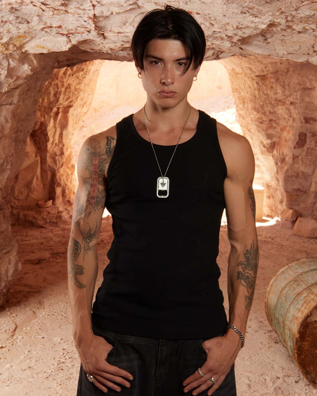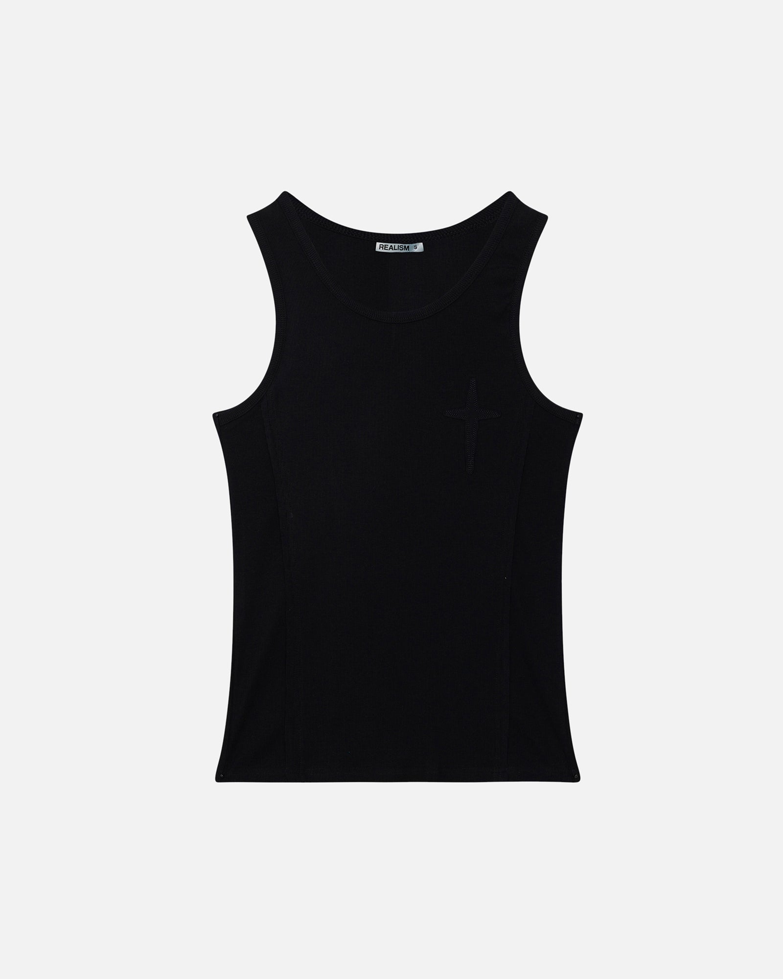 This heavy-weight ribbed tank is more than just a base for layering. Sporting raw-edge side panelling on the back, front and sides, a double stitched star patch on the chest, embroidered details on the back of the neck, it's ideal for all seasons and settings.